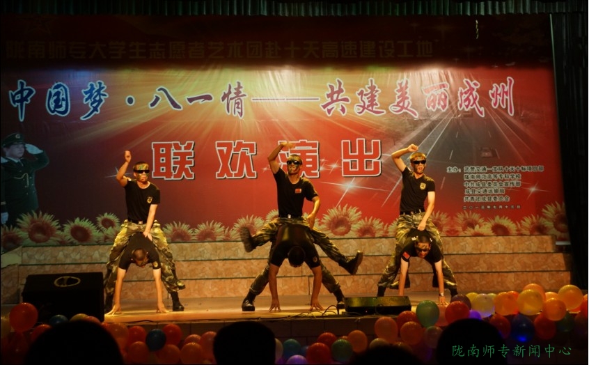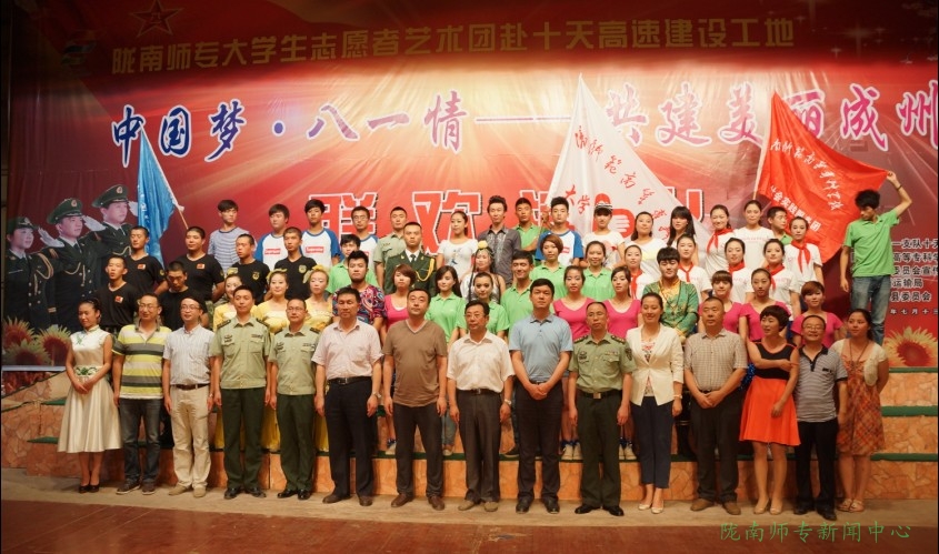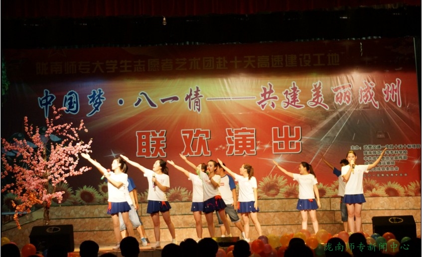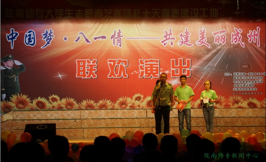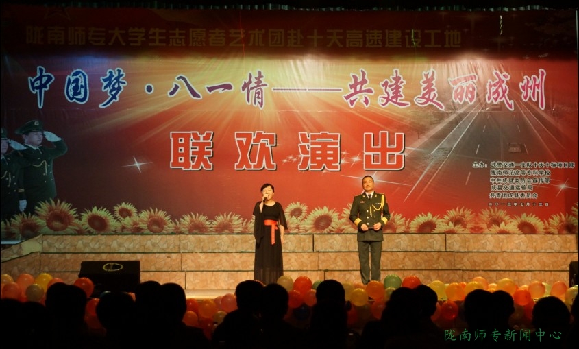 一首首饱含深情的歌曲,一张张真情流露的笑脸,再现了beat365大学生志愿者艺术团赴十天高速第十标段慰问演出的欢乐现场。7月13日晚,“中国梦·八一情——共建美丽成州”beat365大学生志愿者艺术团赴十天高速建设工地慰问演出在文体活动中心举行。