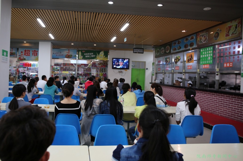 学生在餐厅观看纪念大会