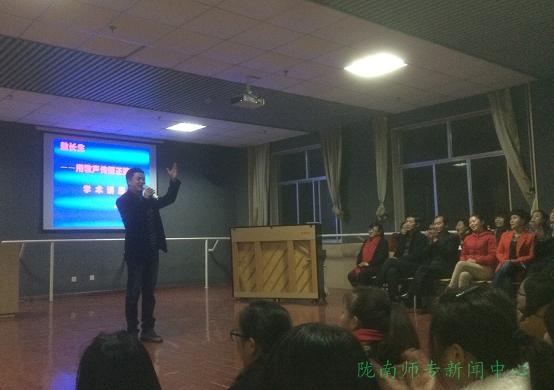 11月6日,武警上海市总队政治部文工团副团长、中华全国青年联合会文艺界委员、军旅男高音歌唱家敖长生在3号教学楼舞蹈厅作了题为《用歌声传播正能量》的学术讲座。音乐系、学前教育学院师生200余人聆听了讲座。讲座由音乐系主任、副教授周新美主持。