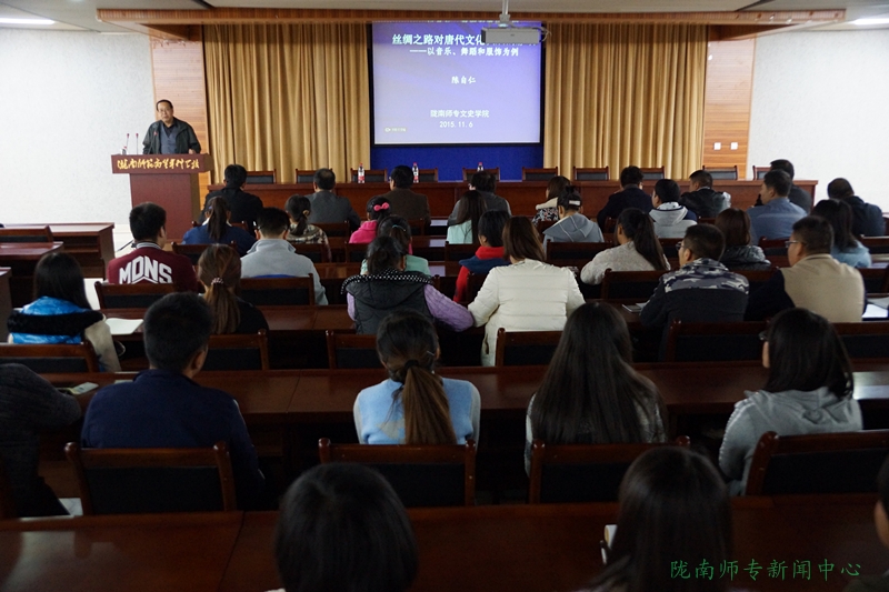 在报告中,陈自仁馆长以音乐、舞蹈和服饰为例,图文并茂地讲述了丝绸之路对唐代社会文化发展的影响,既追溯了历史,又展示了文化内涵,体现了他文史兼容的学术风格。