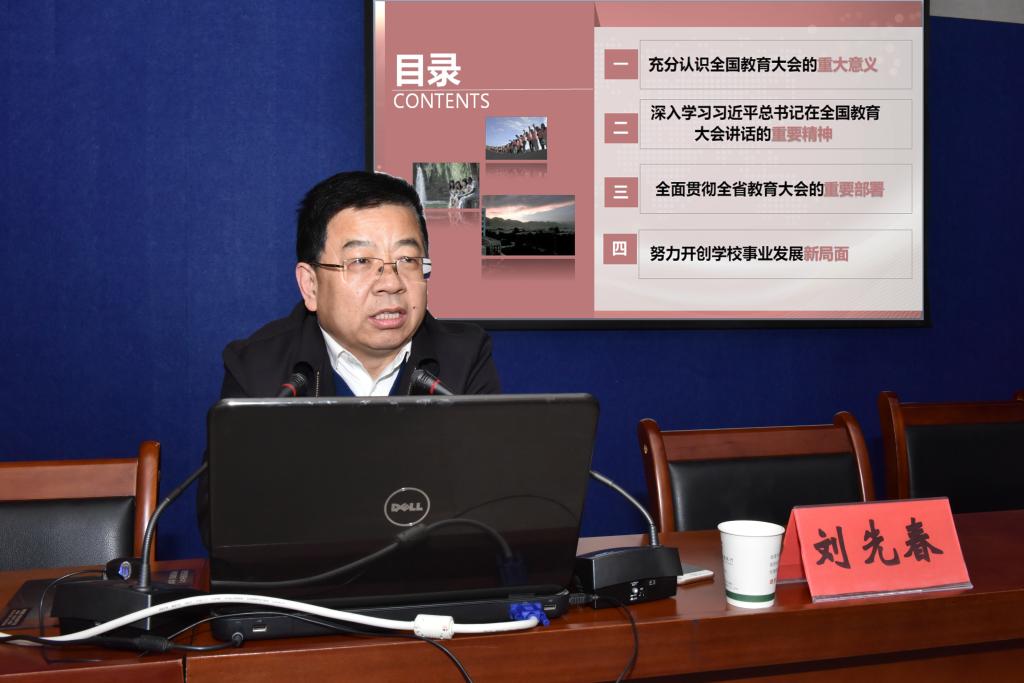 刘先春阐述到,全国教育大会时机好、规格高、影响大、意义重大。大会顺应历史潮流、体现历史规律,在新的历史起点上开启了新时代教育事业新征程;高举旗帜、统一思想,全面深刻阐释了新时代教育改革发展重大理论和实践问题;总结成绩、肯定贡献,更加坚定了走中国特色社会主义教育发展道路的信念信心;直面问题、回应期盼,为新时代教育改革发展的伟大实践指明了方向;谋划未来吹响号角,对加快推进教育现代化、建设教育强国、办好人民满意的教育进行了全面系统部署。