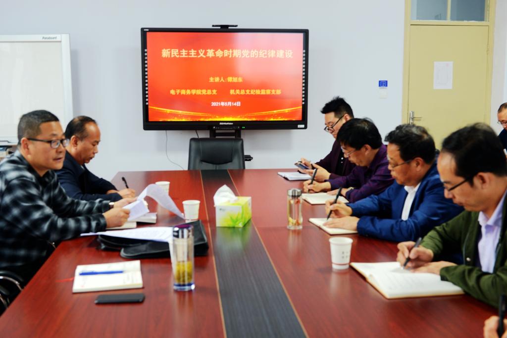 党委委员、纪委书记、监察专员镡旭东为电子商务学院教师党员、机关总支纪检监察支部党员干部讲授了题为《新民主主义革命时期党的纪律建设》的党课。他选取了若干重大历史事件,以党的一大到七大通过的党章对纪律的不同要求及其特点为主线,系统讲解了新民主主义革命时期党的纪律建设问题以及“全面从严治党,就要把党的纪律和规矩挺在前面”的深刻内涵。从党的百年奋斗历程中把握历史规律、汲取真理力量,推动党史学习教育走深走实,以优异成绩迎接建党100周年。