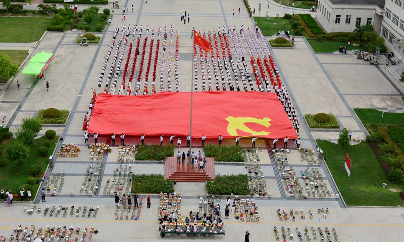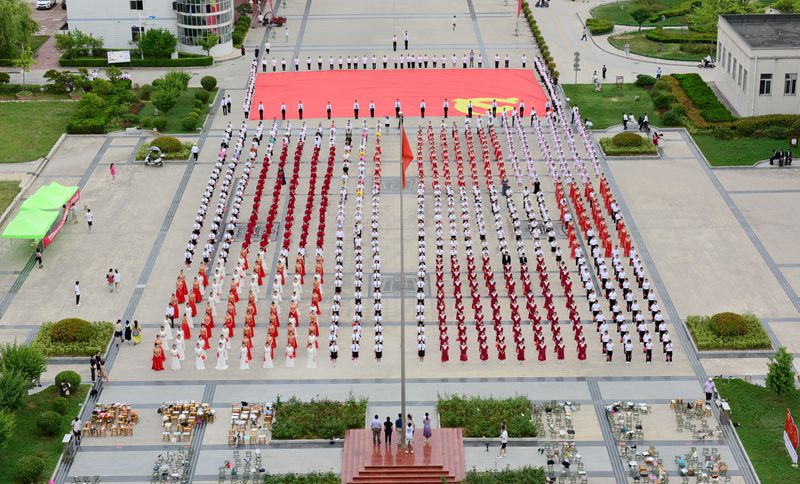 在雄壮的《红旗颂》音乐声中,一面长30米、宽20米的巨幅党旗,从广场上方徐徐展开,在该学院1000余名师生中接力传递。巨大的党旗,在众人的托举下,犹如红色的巨浪,奔流不息。党旗下,大家振臂高呼:“伟大的中国共产党万岁!人民有信仰,国家有力量,民族有希望!”口号声此起彼伏,一浪高过一浪。大家用喜悦的心绪和高涨的激情,向党的百年华诞,献上真挚的问候和美好的祝福。