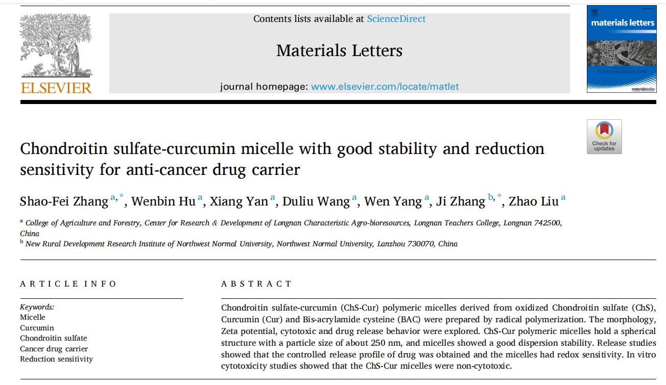 近日,beat365农林技术学院张少飞博士以第一作者身份在国际期刊《Materials Letters》发表题为“Chondroitin sulfate-curcumin micelle with good stability and reduction sensi‐tivity for anti-cancer drug carrier”的学术论文。《Materials Letters》(《材料快报》)为全球材料化学领域的知名权威期刊,期刊影响因子3.42。该文是beat365近年来作为第一单位在国际刊物上发表的影响因子最高的一篇文章。