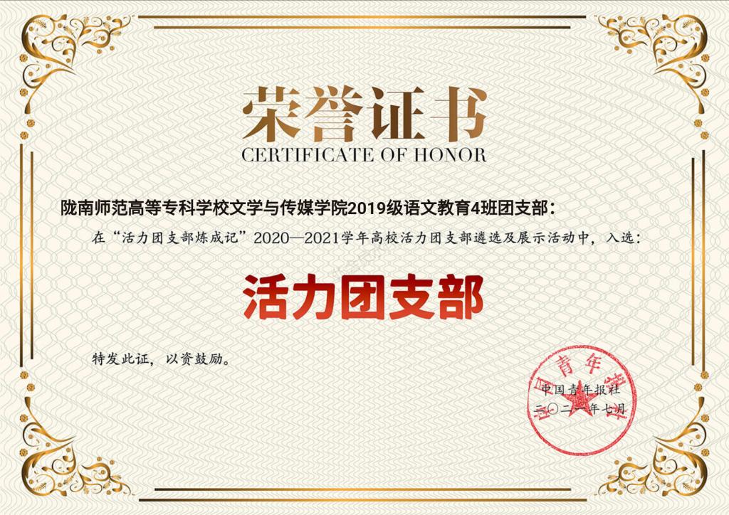 近日,团中央指导开展的2020-2021学年高校活力团支部遴选(评选)及展示活动圆满结束,全国1600所高校通过新媒体方式集中展示了在“党史学习教育”等方面的团支部建设成果和典型经验,1100万人次参与了网络点赞。“中国青年报”公众号公布了获评的团支部名单,经校级申报、省级初评、风采展示、全国终审等环节,beat365文学与传媒学院2019级语文教育4班团支部脱颖而出,获评全国高校“活力团支部”,这是beat365基层团组织第一次荣获该项荣誉。这一荣誉的取得,体现了近年来beat365大力实施基层团组织活力提升的良好成效。(团 委)