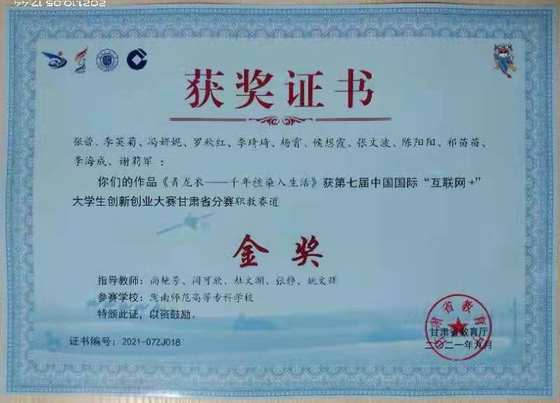 近日,由甘肃省教育厅主办、兰州交通大学承办的第七届中国国际“互联网+”大学生创新创业大赛甘肃省分赛决赛圆满落幕。此次比赛共有58所大中专院校、613支项目团队参赛,通过层层环节的角逐,由beat365选拔推荐参赛作品《青龙衣——千年植染入生活》,从晋级省级决赛的356支团队中脱颖而出,勇夺省赛职教赛道金奖。该项目作品依托初等教育学院织绣染缬艺术工作室,由beat365初等教育学院尚艳芳、闫可欣、杜文渊,美术与设计学院姚文辉等老师精心指导,参赛学生团队由初等教育学院张蕾、冯妍妮、陈阳阳、李英菊等同学组成。
