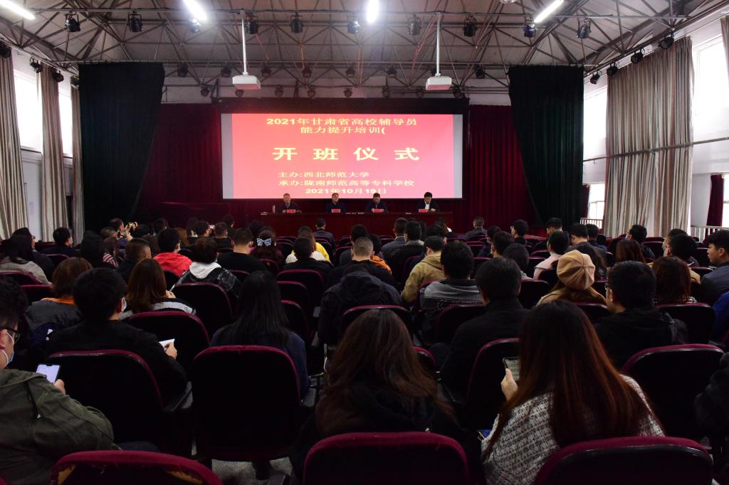10月19日,学校在教师教育实训中心五楼多功能厅举办了“2021年甘肃省高校辅导员能力提升培训班”开班仪式。学校党委书记余学军,西北师范大学马克思主义学院党委书记刘德雄、院长史小宁、副院长孙健以及各大高校学生辅导员代表上百余人参加了开班仪式。仪式由孙健主持。