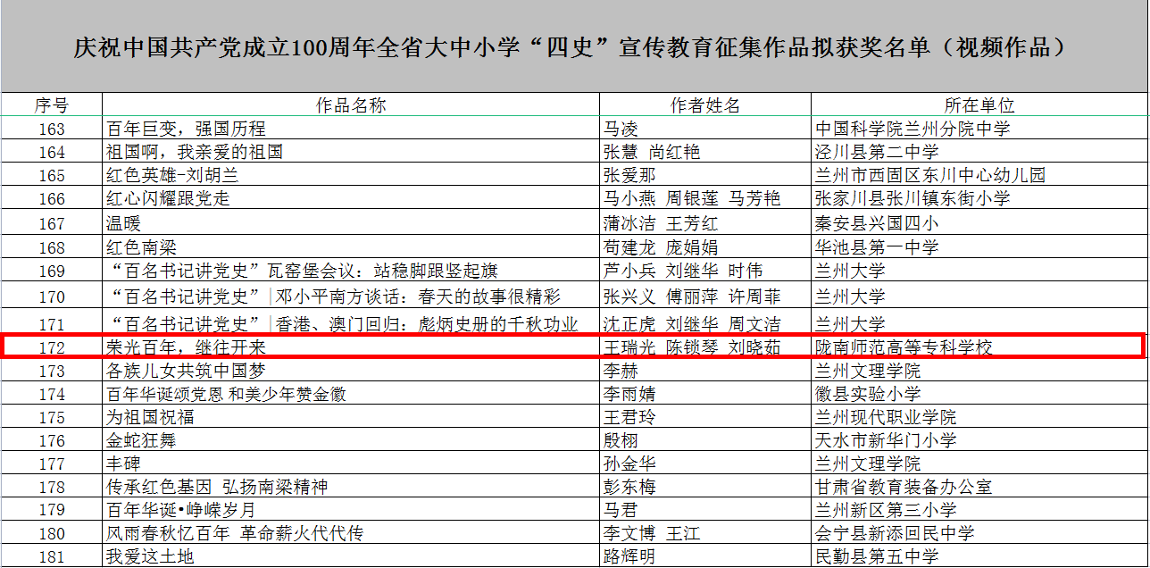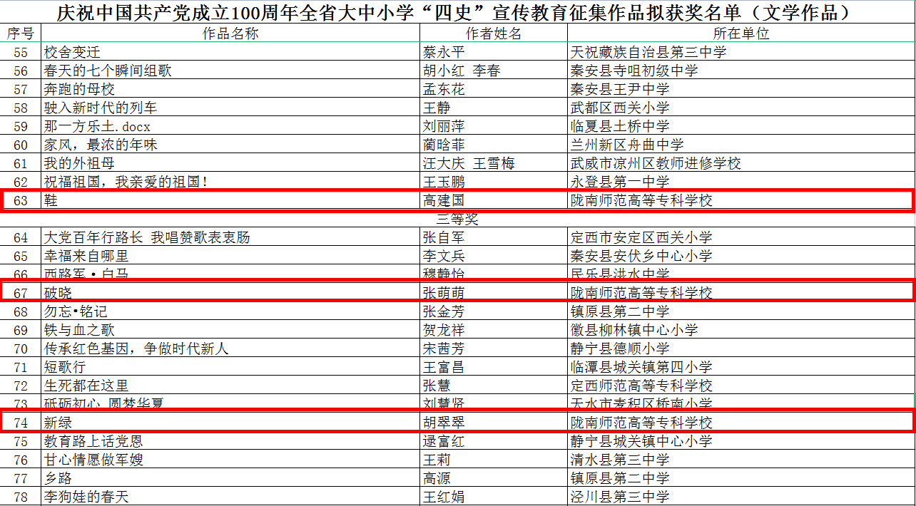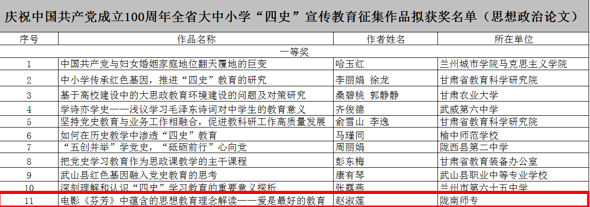 近日,省委宣传部、省委教育工委、省教育厅通报了关于庆祝中国共产党成立100周年全省大中小学“四史”宣传教育作品征集作品评选结果,beat365师生获得佳绩。思想政治论文类作品中,赵淑莲《电影<芬芳>中蕴含的思想教育理念解读——爱是最好的教育》荣获一等奖;文学类作品中,高建国《鞋》荣获二等奖,张萌萌《破晓》、胡翠翠《新绿》荣获三等奖;视频类作品中,王瑞光、陈锁琴、刘晓茹《荣光百年,继往开来》荣获三等奖。