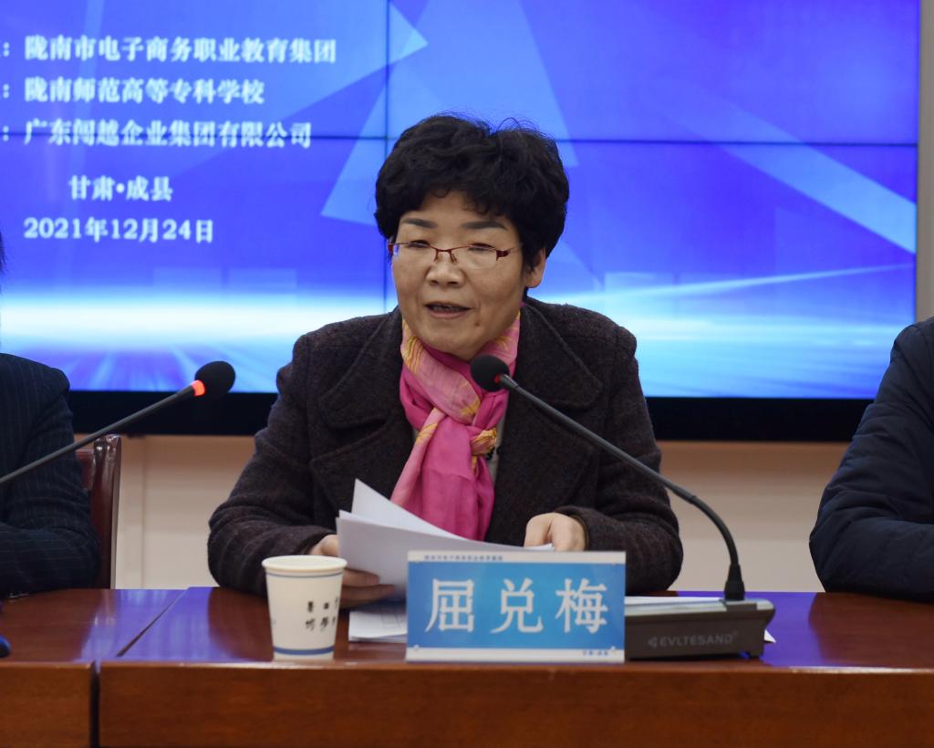 屈兑梅代表陇南市教育局对陇南市电子商务职业教育集团的成立表示热烈祝贺。她强调,陇南市电子商务职业教育集团的成立,对于推进职业教育人才培养模式的改革,提升陇南市职业教育整体实力和办学水平具有重大的意义。她希望职教集团进一步探索校企合作、产学研结合发展的路子,培养适应互联网经济发展的复合型、应用型专门人才,更好地整合行业、企业和职业教育资源,发挥区域示范性带动作用,为陇南市全面推进乡村振兴、加快农业农村现代化贡献力量。她表示,市教育局将以集团成立为契机,深入贯彻落实中央和省委、市委决策部署,进一步加大工作力度,充分发挥牵线搭桥和服务保障的作用,积极推动全市职业院校与企业、行业协会深度合作。