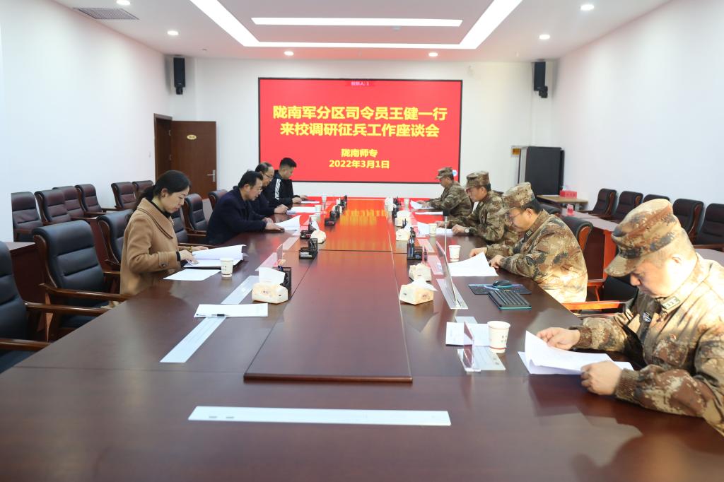 3月1日,陇南军分区司令员王健一行、成县人武部部长李方岩、政委姚宏陪同调研beat365大学生征兵工作,学校党委副书记王莹成主持座谈会,学生处负责人李晓江陪同调研。