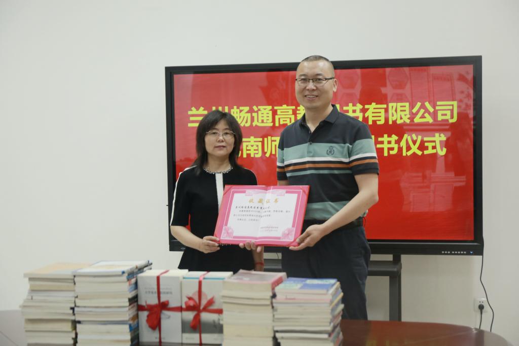 校长李艳红代表学校向兰州畅通高教图书有限公司代表贺双虎颁发收藏证书
