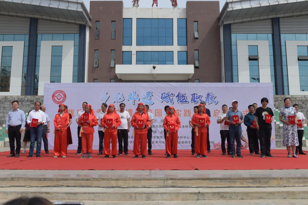 王胜青和相关部门负责人为各位非遗传承人颁发“陇南师专非遗课程指导教师”聘书,并宣布学校“非遗进校园”实践活动开始。