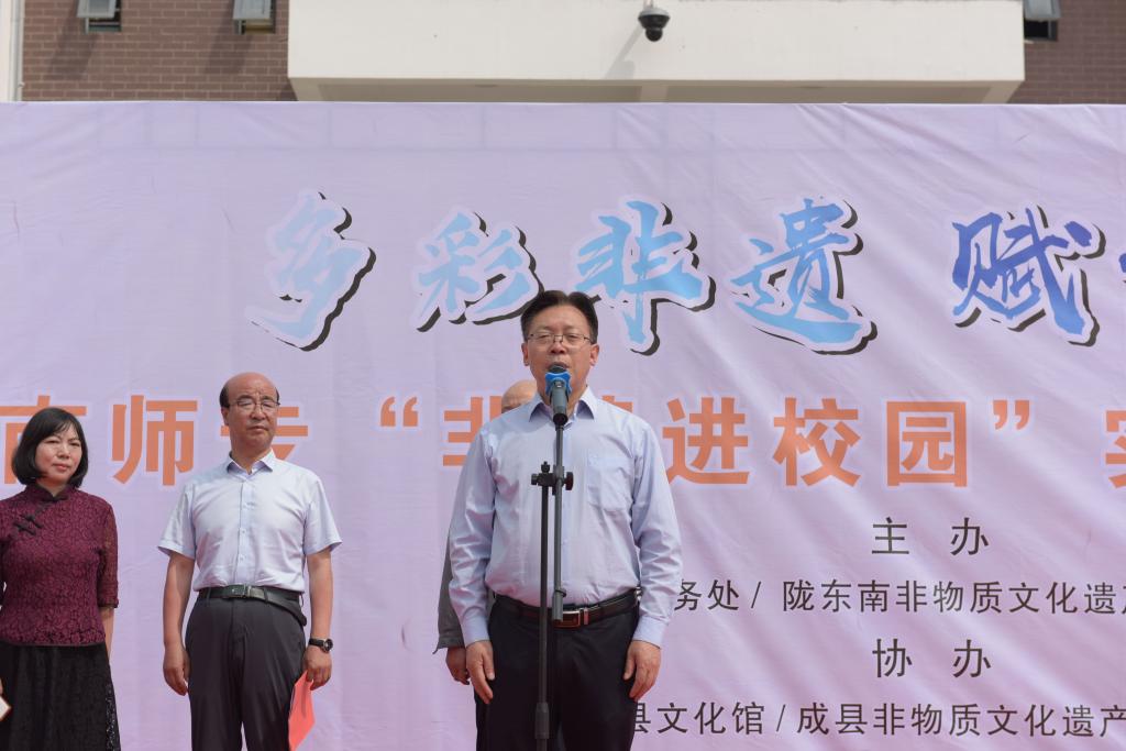 6月11日上午,为了深入推进非物质文化遗产保护,传承中华民族生生不息的传统文化,进一步宣传“文化和自然遗产日”,学校举行“非遗进校园”实践活动启动仪式。成县文化馆馆长、成县非物质文化遗产保护中心主任成志杰,成县非物质文化遗产保护中心副主任唐虹,学校副校长王胜青,校史馆、教务处和相关部门负责人以及徽县、成县非遗传承人和民间艺人参加了活动。