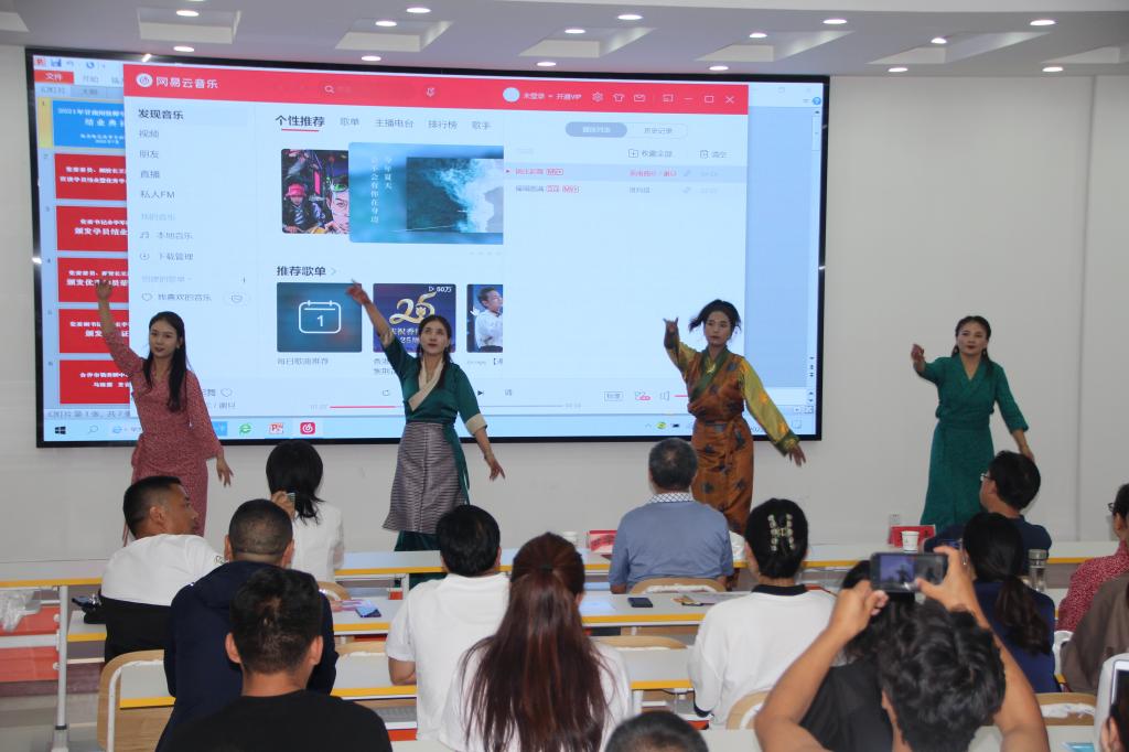 学员代表、合作市勒秀镇中心小学马琼燕老师作了发言,嘎扎苏怒、嘎嘎、娘毛才让、勒毛才让等8位学员分别表演了吉他弹唱《吉祥祝福》、舞蹈《福泽家园》、歌曲《白塔》和锅庄舞。