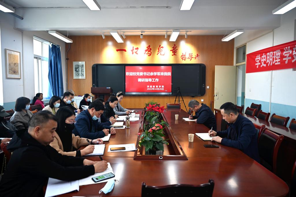 余学军认真听取汇报后,对学院如何进一步做好工作提出了四个要求:一要以疫情防控为当前的重大工作,一丝不苟做好各种应对预案和物资准备,做到责任到人、不留死角;二要在学习党的二十大精神和主动提升教书育人能力上下功夫,加快学习和应用信息技术、数字技术、人工智能技术,掌握现代教育科技,为全面贯彻党的教育方针做出努力;三是学院领导班子要主动谋划,做有理想、有本领、有担当的管理者,带领学院教师把智慧和力量凝聚到学校发展的各项任务上;四是要补齐科研短板,瞄准基层幼儿园发展,从解决幼儿教育的实际问题入手,将科学研究聚焦在幼儿园的品质提升上,坚持“走出去”和“请进来”相结合,为教师科研活动搭建平台,提升教师教学科研水平,推动学校发展提质增速。(学前教育学院
