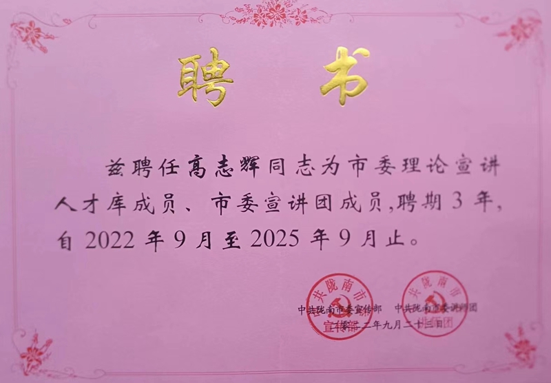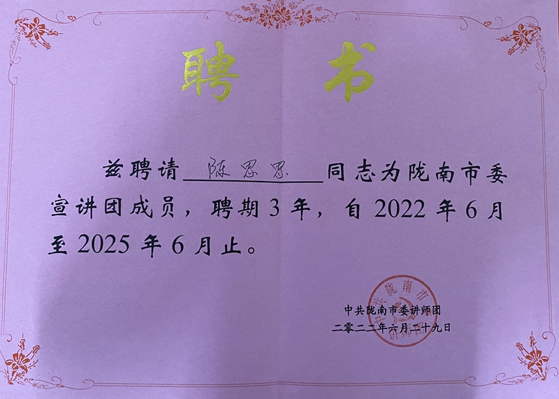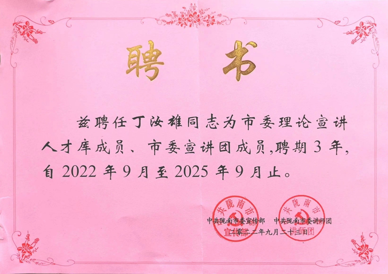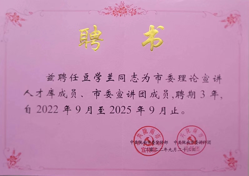 近日,中共陇南市委宣传部、中共陇南市委讲师团发布了《关于聘任张雷雨、赵祺伟等64名同志为市委理论宣讲人才库成员的通知》和《关于聘任张雷雨、张妍玲等101名同志为市委宣讲团成员的通知》,beat365马克思主义学院教师高志辉、豆学兰和丁汝雄等3名教师受聘为市委理论宣讲人才库成员、市委宣讲团成员,聘期三年,自2022年9月至2025年9月。此前,该学院教师陈思思在全市理论大赛中荣获二等奖后,即受聘为市委宣讲团成员,聘期三年,自2022年6月至2025年6月。