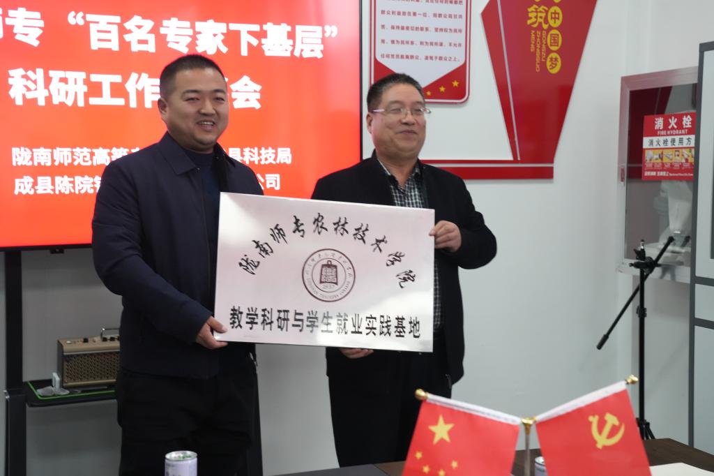 农林技术学院院长王让军向陇小南授予“陇南师专农林技术学院教学科研与学生就业实践基地”标牌。