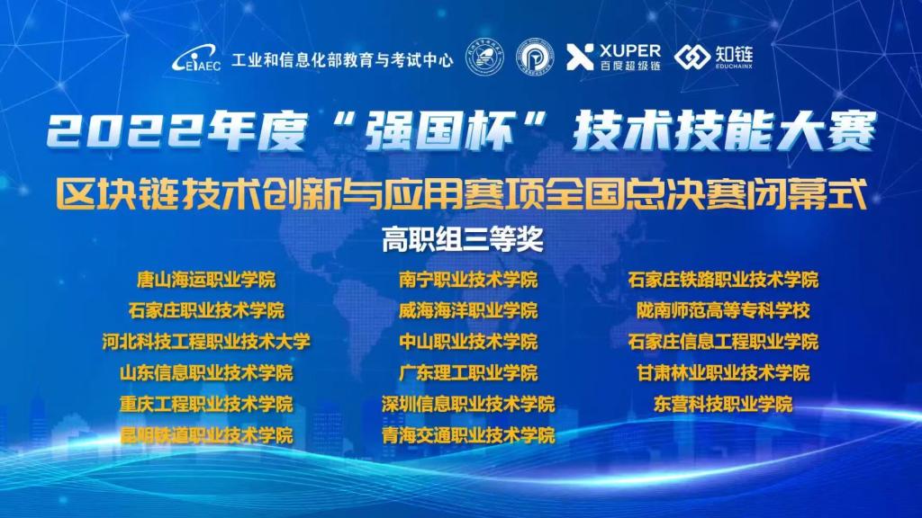 2022年度“强国杯”技术技能大赛区块链技术创新与应用赛项全国总决赛12月3日在线上举办。首次参加比赛的beat365代表队发挥出色,获得高职组三等奖。