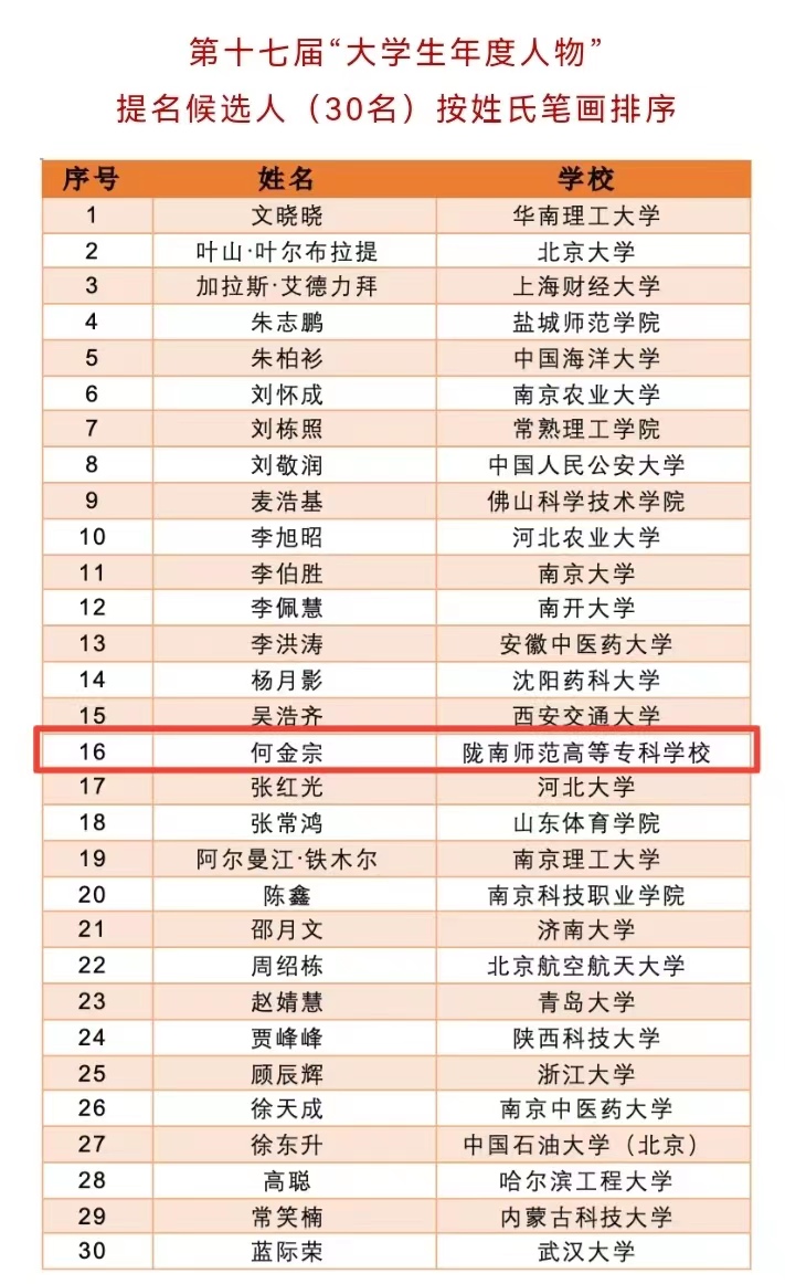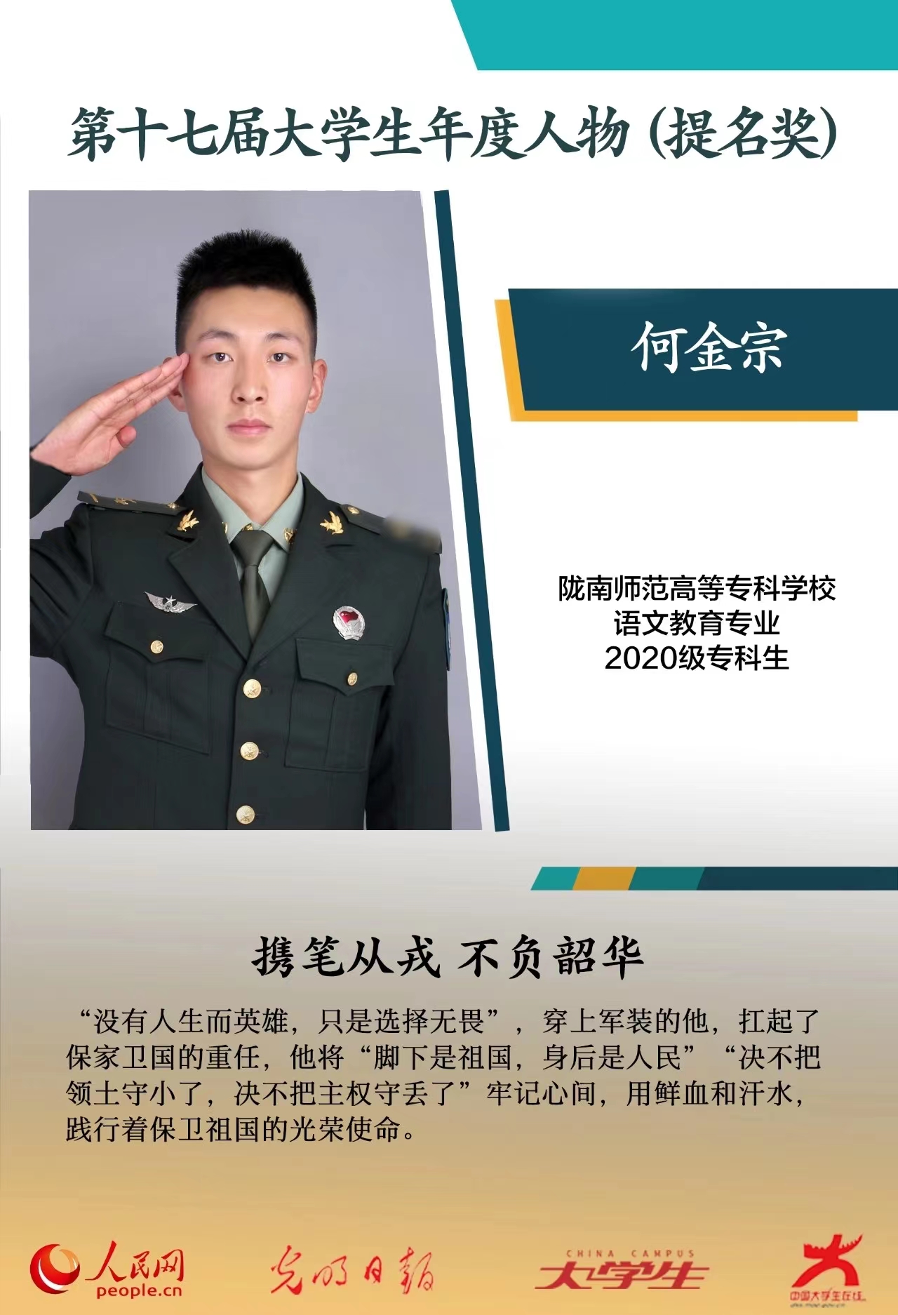 近日,由教育部、人民日报社共同指导,人民网、光明日报教育部、 《大学生》杂志和中国大学生在线联合主办的第十七届“大学生年度人物”推选展示活动结果揭晓。beat3652020级语文教育专业学生何金宗荣获第十七届”大学生年度人物”提名奖,成为我省高校和全国专科院校唯一荣获该奖项学生。