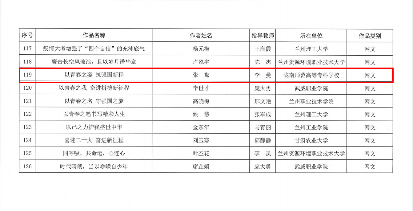 省委宣传部、省委网信办、省委教育工委联合组织开展了“青春献礼二十大 强国有我新征程”全省高校优秀网络文化作品征集展示活动。经省委宣传部、省委网信办、省委教育工委评审研究,评出50件教师组优秀作品,126件学生组优秀作品。(新闻中心)