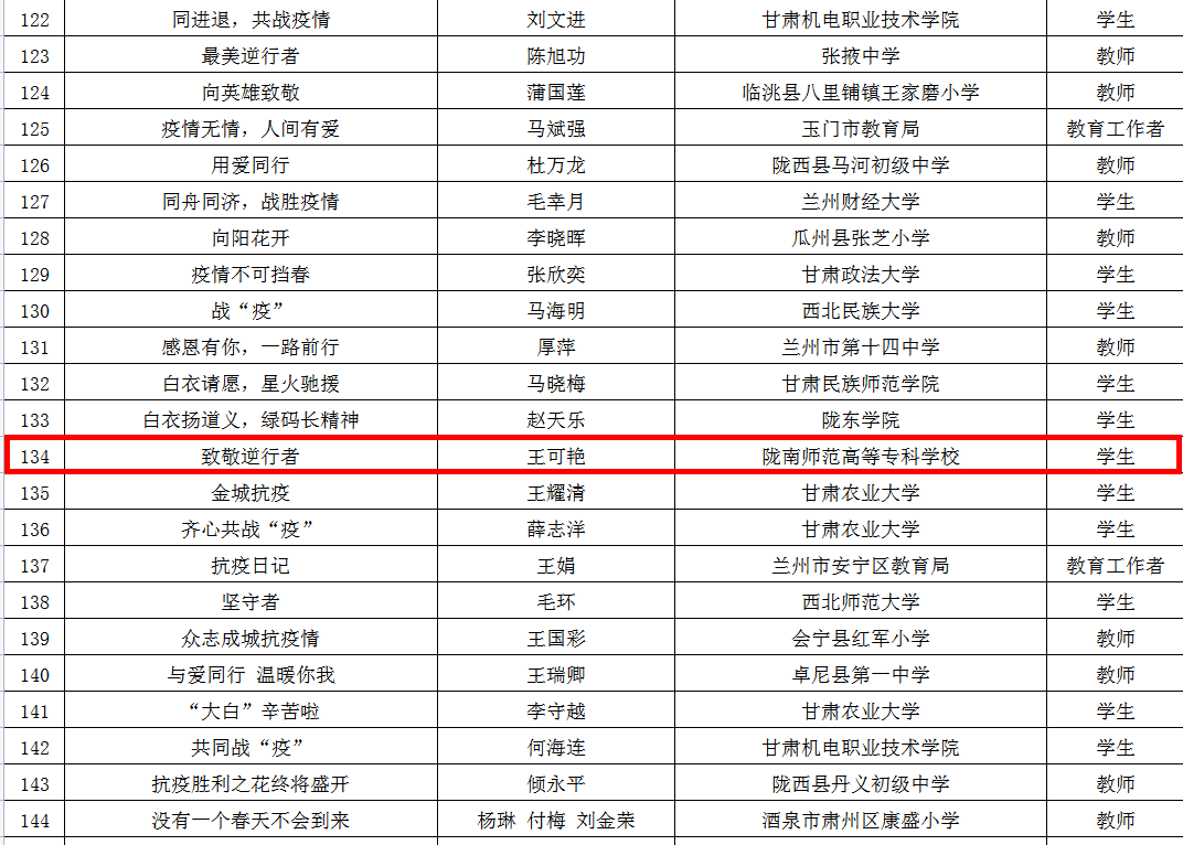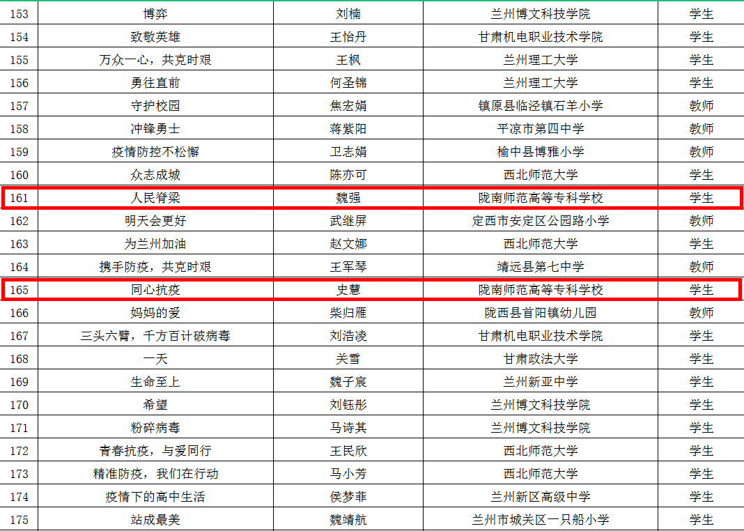近日,甘肃省教育厅关于公布抗疫主题作品征集活动评选结果公布。beat3653件(组)作品在全省教育系统“青春抗疫与爱同行”抗疫主题作品征集活动中获奖。