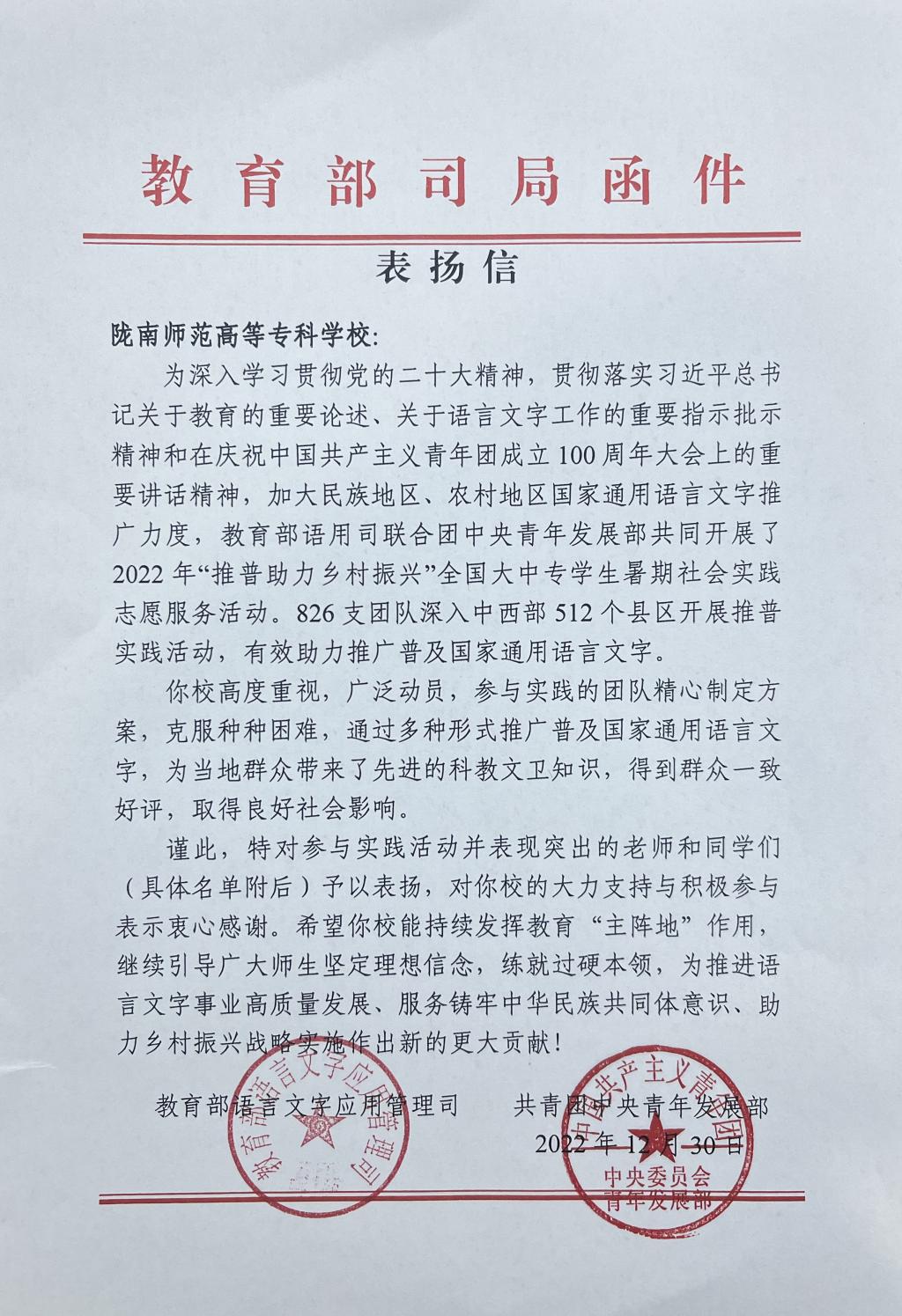 2月,教育部语用司、共青团中央青年发展部对2022826支各高校推普助力乡村振兴全国大中专学生暑期社会实践志愿服务活动开展情况,进行了两轮评选,遴选出165支优秀团队,beat365赴陇南市武都区坪垭藏族乡“推普助力乡村振兴”服务队榜上有名,被评为2022推普助力乡村振兴全国大中专学生暑期社会实践志愿服务优秀团队。教育部语用司、共青团中央青年发展部向beat365发来表扬信,对beat365推广普及国家通用语言文字工作取得的成绩给予了充分肯定,并希望beat365充分发挥国家语言文字推广基地“主阵地”作用,为推进语言文字事业高质量发展、服务铸牢中华民族共同体意识、助力乡村振兴战略实施做出新的更大贡献。