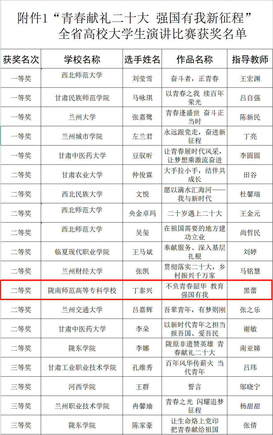 近日,由中共甘肃省委教育工作委员会、甘肃省教育厅主办,甘肃省教育国际交流与合作服务中心承办的“青春献礼二十大 强国有我新征程”甘肃省高校大学生演讲比赛结果公布,beat365学前教育学院学生丁泰兴(指导教师:黑蕾)在此次比赛中荣获二等奖。