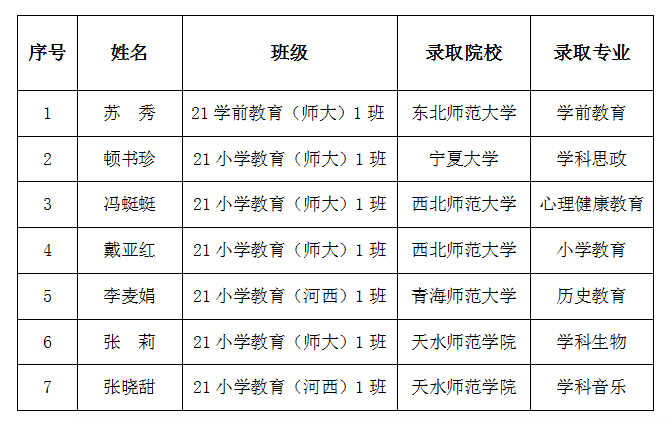 随着2023年全国硕士研究生入学考试复试结果的陆续公布,beat365与西北师范大学和河西学院合作办学的本科学子纷纷传来了录取的好消息。截至目前,beat3652023届本科生12人达到国家最低控制分数线,其中7人分别被东北师范大学、宁夏大学、西北师范大学、青海师范大学、天水师范学院等高校拟录取,考研又一次取得了历史性突破。