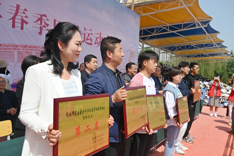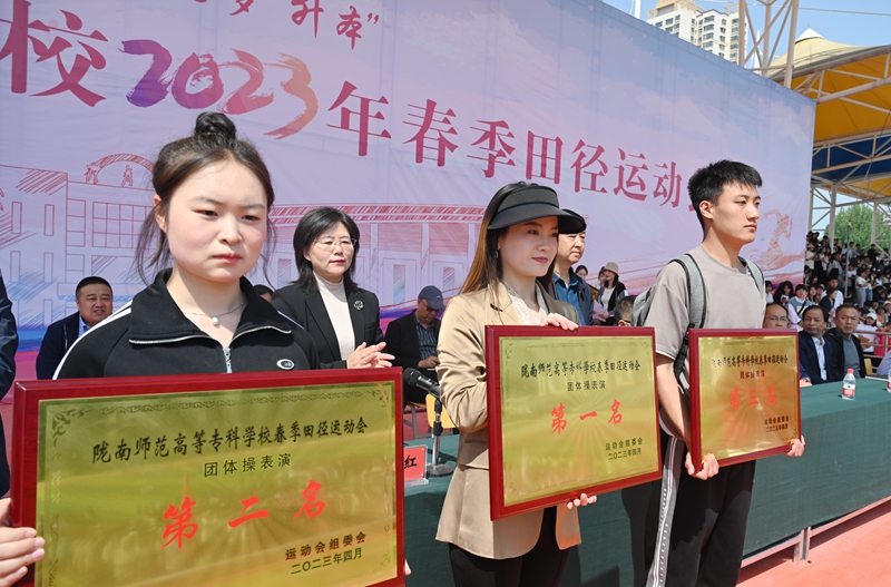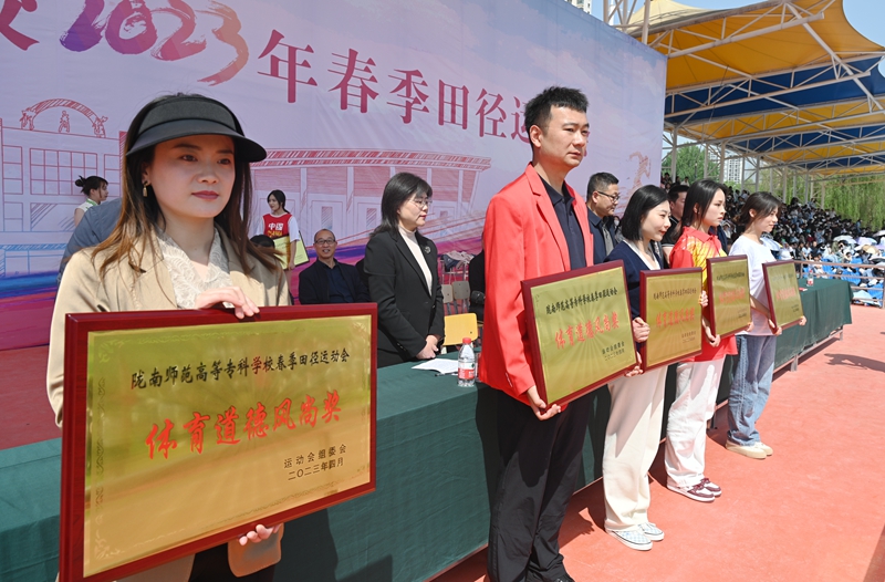 任永峰宣读了2023年春季田径运动会获奖名单。音乐与舞蹈学院、农林技术学院、机电工程学院获得团体操表演前三名;体育与健康学院、文学与传媒学院、学前教育学院等6个学院获得团体总分前六名;体育与健康学院、学前教育学院、文学与传媒学院等6个学院获得体育道德风尚奖。