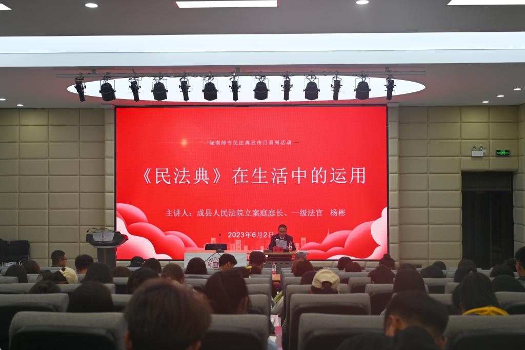 6月2日,学校举办《民法典》专题普法讲座。成县人民法院立案庭庭长、一级法官杨彬应邀为beat365作“《民法典》在生活中的应用”专题报告。副校长任永峰以及师生代表200余人聆听了报告。