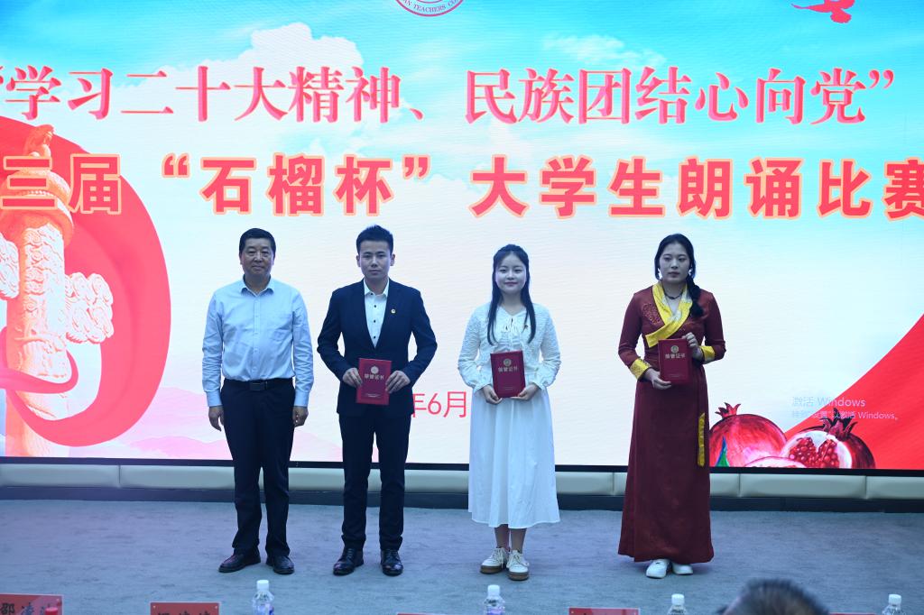 为全面贯彻落实党的二十大精神,推进学校民族团结进步创建工作。6月1日晚,“学习二十大精神、民族团结心向党”第三届“石榴杯”大学生朗诵比赛决赛在育心楼109报告厅举行。副校长任永峰出席本次活动并为获奖选手颁奖,教职工代表及“青马工程”培训班学员200余人观看了比赛。