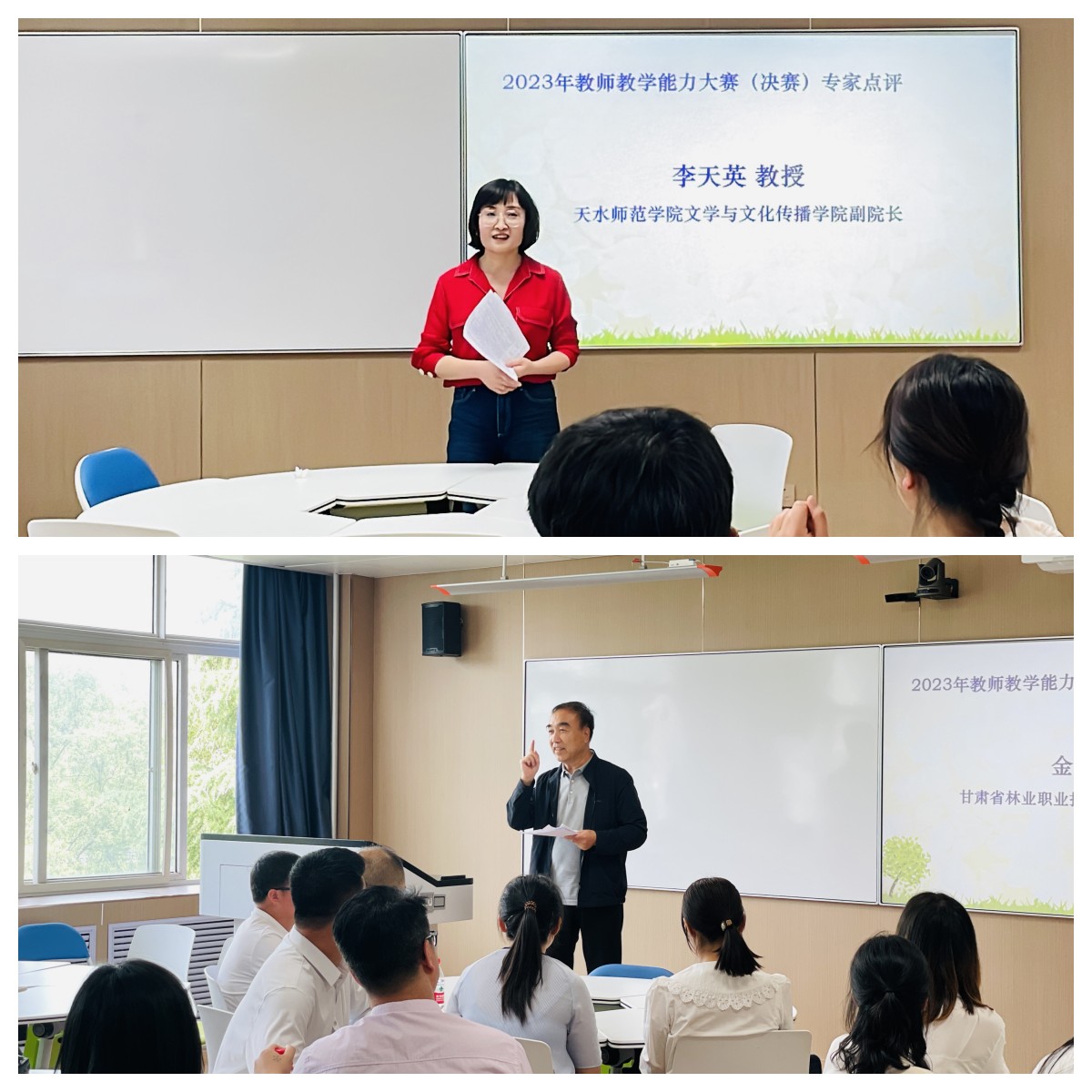 比赛结束后,评委组组长、甘肃省林业职业技术学院教师发展中心金贵峻教授,甘肃省第三届高校教师教学创新大赛新文科组一等奖获得者、天水师范学院文传学院副院长李天英教授就专业组、公共基础组选手的现场表现进行了点评指导。从参赛准备、教学设计、内容精炼等方面提出建设性意见。