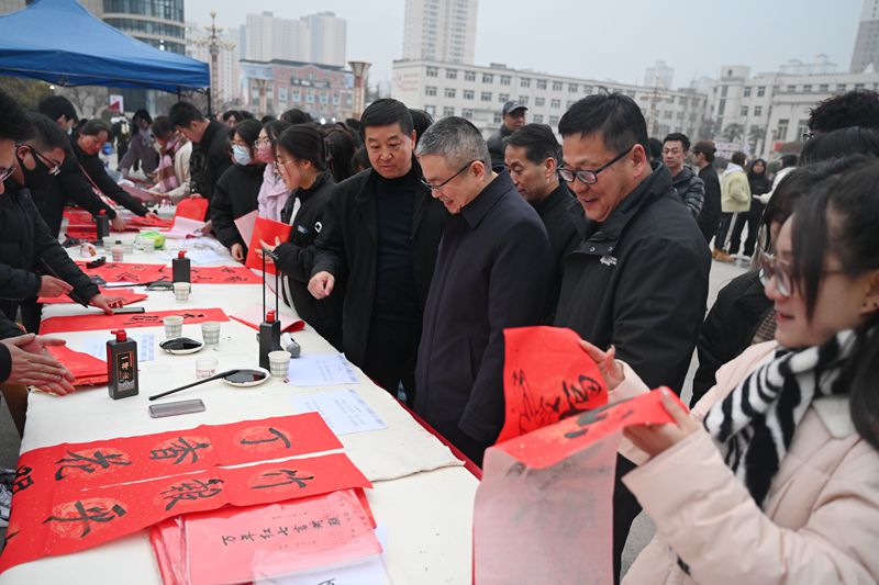 师生们在现场书写春联,挥毫泼墨、尽情创作,一幅幅大红的春联和一张张大“福”,将浓浓的新春祝福诉诸笔端、送进师生心田,表达了辞旧迎新的美好愿景。选春联、写春联、晾春联,现场气氛祥和热烈。许多到现场观摩的师生夸赞不已、争相领取,表示本次活动让墨香浸润校园,把中华优秀传统文化发扬光大,寓意祥和的春联、福字道出了广大师生对美好生活的向往。