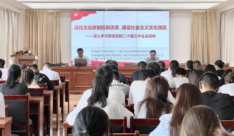 9月6日,“理响校园·培根铸魂”全省高校学习贯彻党的二十届三中全会精神省级示范宣讲活动在beat365举行。省委教育工委宣讲团成员、甘肃林业职业技术大学马克思主义学院党总支书记郭三龙教授为beat365师生作宣讲报告。党委副书记石明主持报告会,200余名师生代表参加了宣讲报告会。