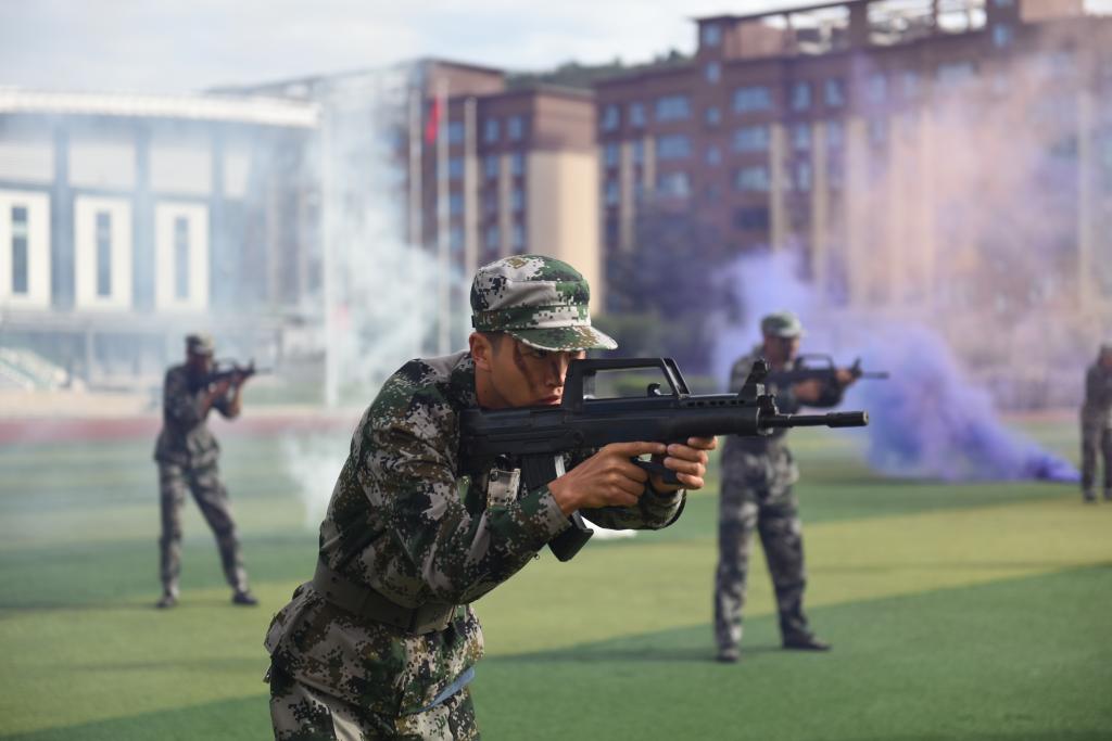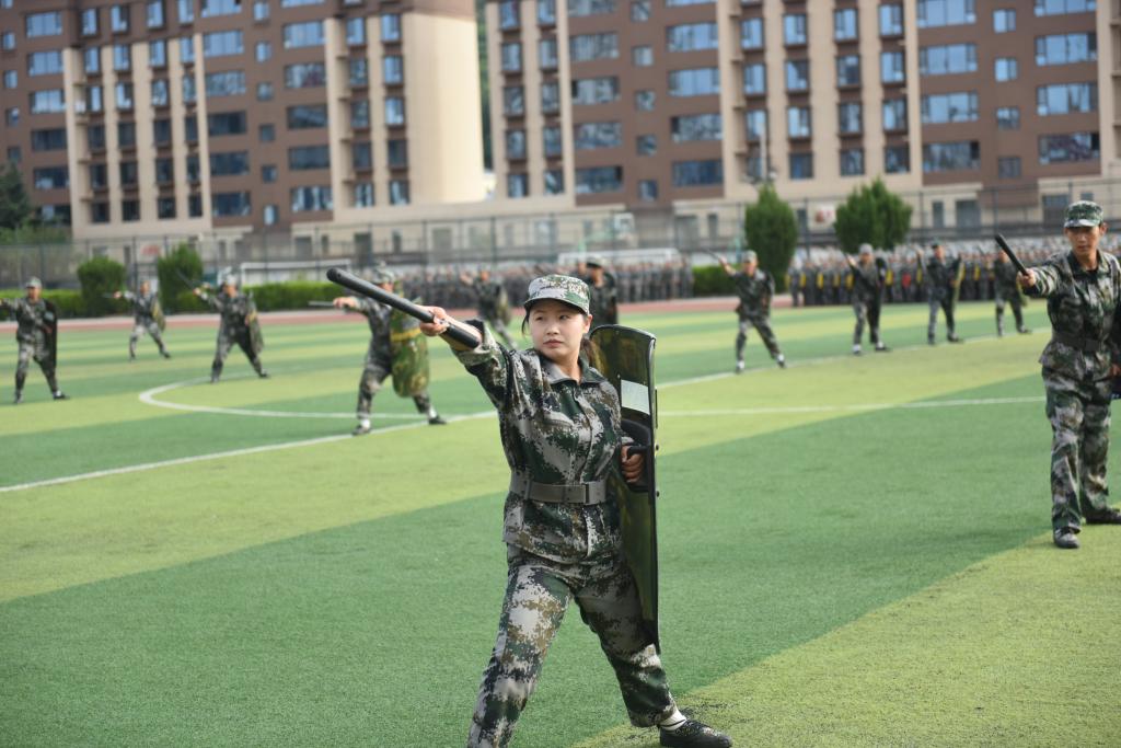分列式军训会操表演结束后,花式队列、刺杀操、警棍盾牌操、战术基础动作、匕首操、擒敌拳轮番上场表演。嘹亮的喊声在操场上此起彼伏,久久回荡,每套动作都迅速有力,一招一式尽现陇师学子的豪迈气魄、奋发昂扬的斗志和永不放弃的追求,同学们精彩的表演赢得了现场观众的阵阵掌声。