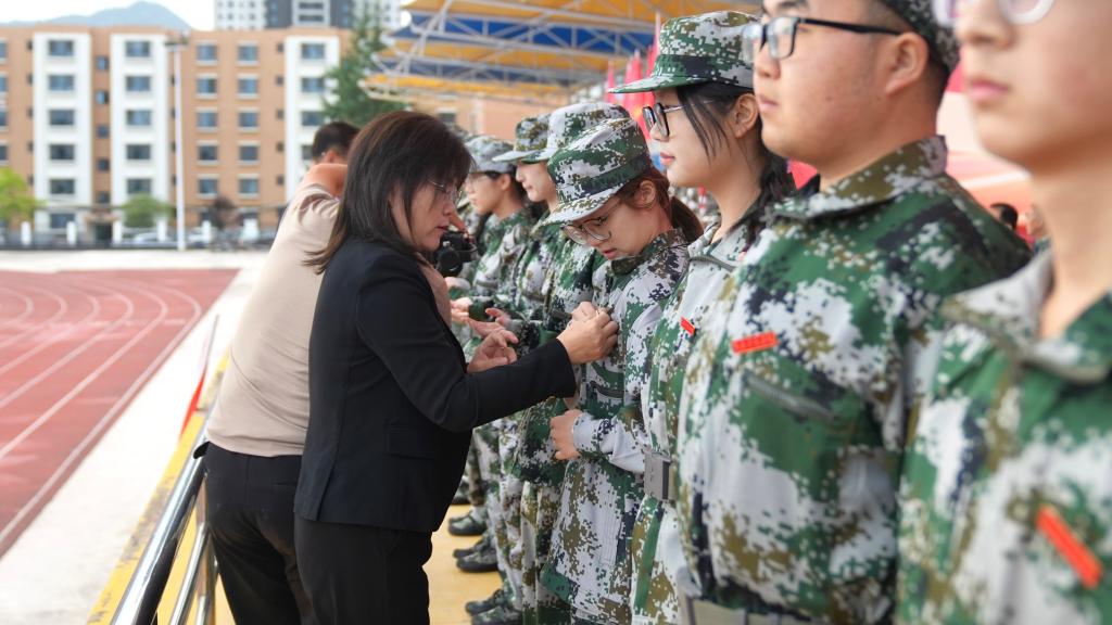向君为2025级新生授军训团团旗,校领导为10个连授连旗。