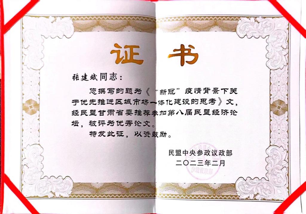 近日,民盟中央第八届民盟经济论坛优秀论文评选结果公布,民盟甘肃省委选送,民盟陇南师专总支部副主委、陇南师专历史文化与旅游学院青年教师、陕西师范大学在读博士张建斌撰写的论文《“新冠”疫情背景下关于优化推进区域市场一体化建设的思考》获评“优秀论文”。