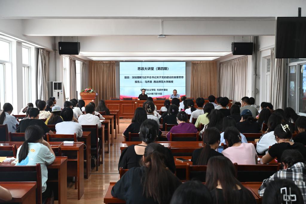 7月10日,西北师范大学马克思主义学院副院长、硕士生导师马乔恩教授应邀来beat365思政大讲堂作了题为“深刻理解习近平总书记关于党的建设的重要思想”的宣讲报告。报告会由马克思主义学院、科研外事处主办,马克思主义学院院长杜向辉主持报告会。beat365师生100余人聆听了报告。