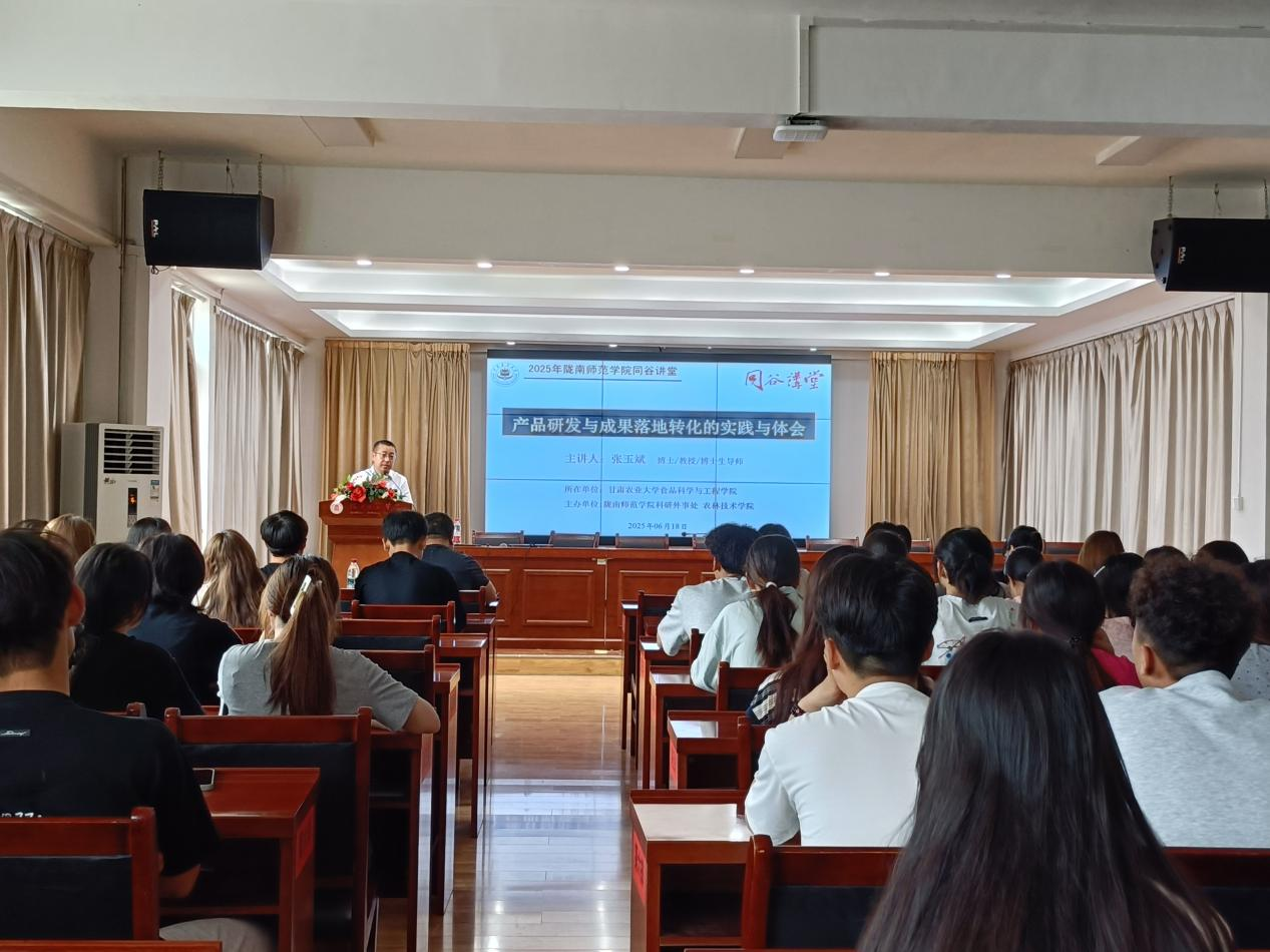 6月18日,甘肃农业大学张玉斌教授应邀,作了题为“产品研发与成果落地转化的实践与体会”的学术报告。农林技术学院师生代表共150余人参加了此次报告会,报告会由农林技术学院副院长何九军主持。