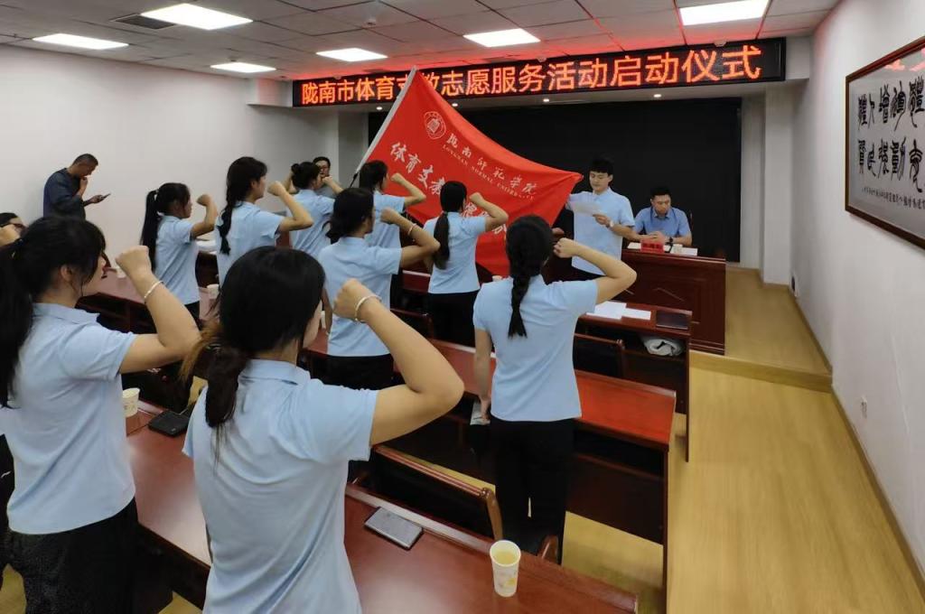 在全场的目光聚焦下,陇南市教育局体艺卫科科长杜旻向体育支教志愿服务队授旗,随后,全体支教志愿者进行庄严宣誓,承诺尽己所能,奉献爱心,服务社会。