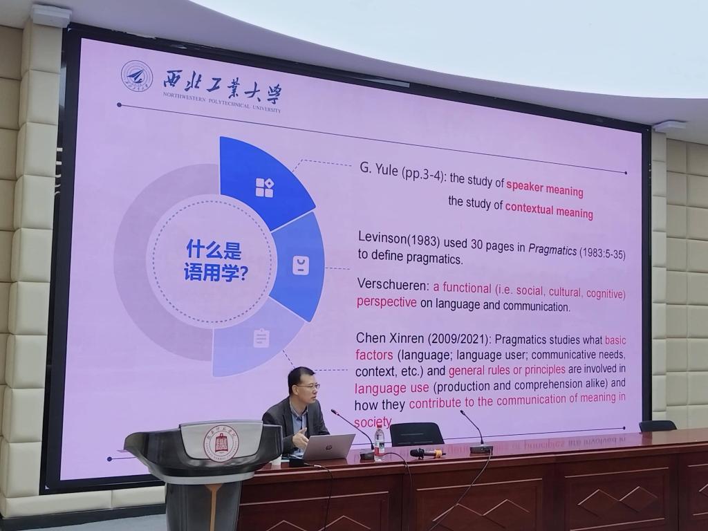 11月12日下午,外国语学院举办学术报告会,特邀西北工业大学外国语学院任育新教授作题为《语用学视角下的AI智能体话语研究:理论、议题与方法》的讲座。报告会由外国语学院院长王惠霞主持,学院教师及部分学生参加。
