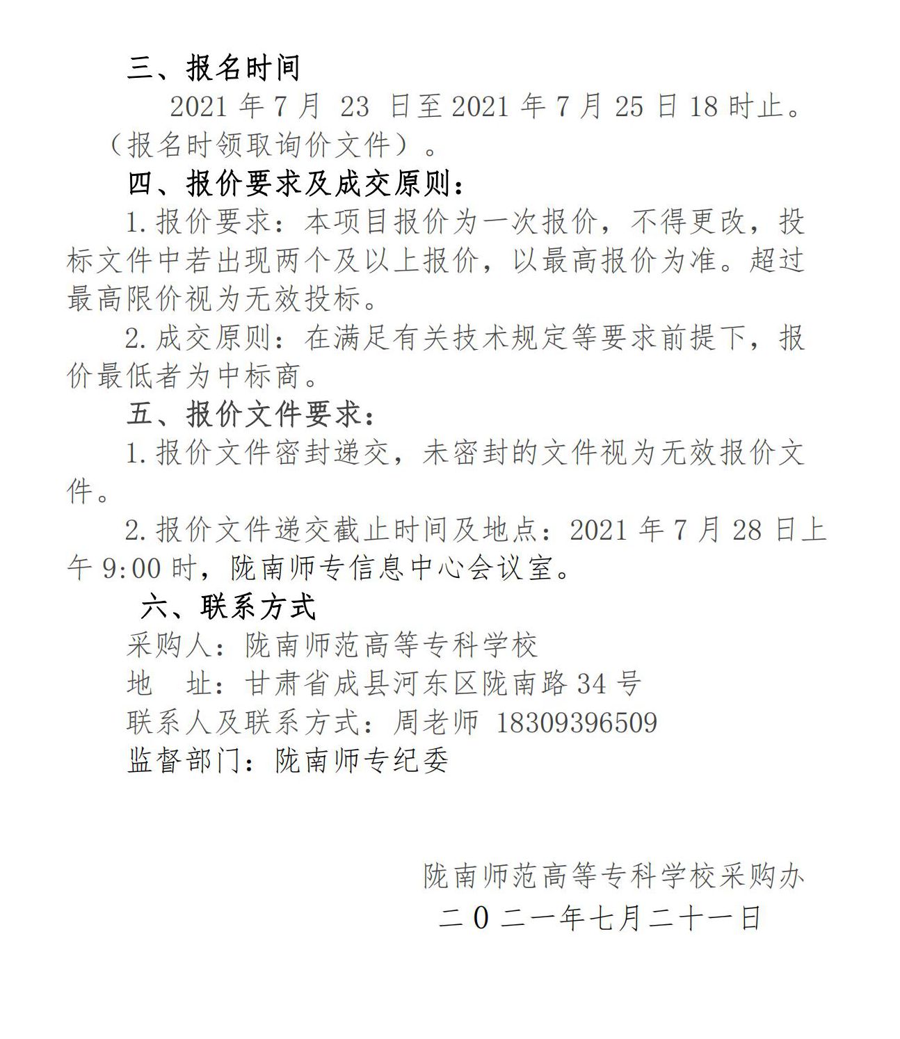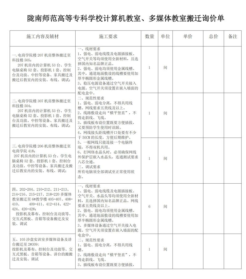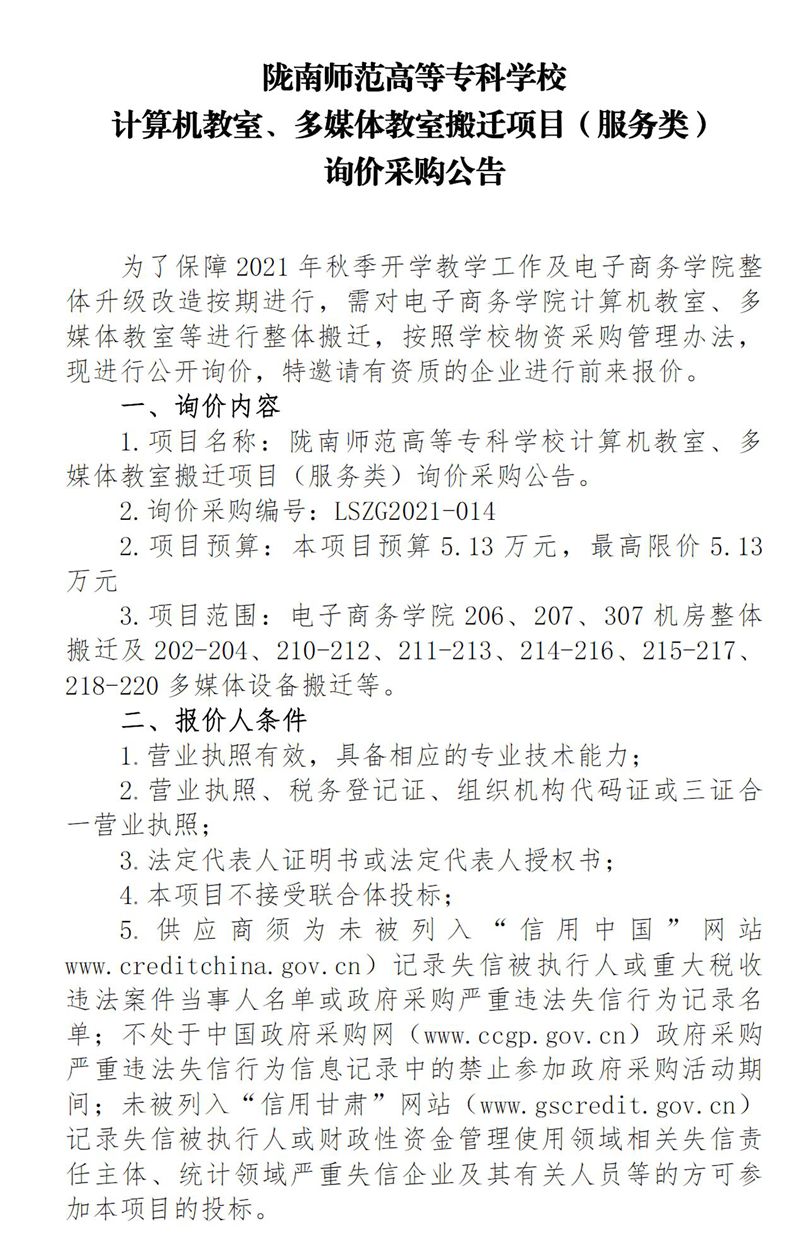 上一条:陇南师范高等专科学校计算机教室、多媒体教室搬迁项目(服务类)由询价采购更改为单一来源采购方式的公示