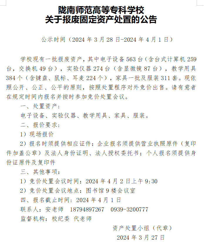 上一条:陇南师范高等专科学校关于报废固定资产处置的公告