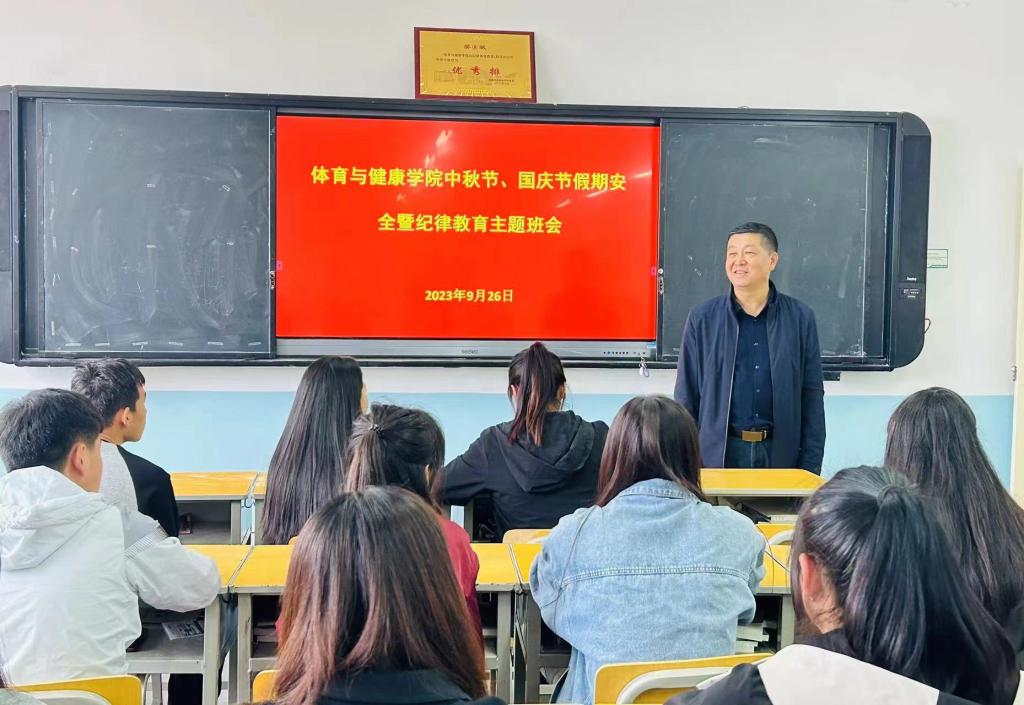 任永峰看望慰问了2023级体育教育1班学生,对同学表示节日的问候与祝福。与同学们进行了亲切交流,并参加了班级中秋节、国庆节假期安全纪律教育主题班会。
