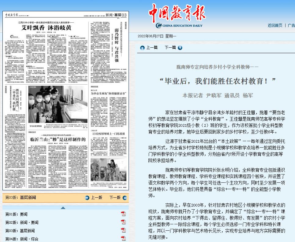 近日,中共甘肃省委教育工作委员会公布了 “甘肃教育好新闻”评选活动获奖名单。beat365报送的新闻作品《陇南师专定向培养乡村小学全科教师——“毕业后,我们能胜任农村教育” 》(2022年6月27日《中国教育报》,记者尹晓军 通讯员杨军)获评“甘肃教育好新闻”二等奖。