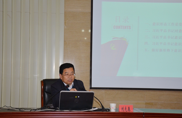 会上,刘先春教授从习近平总书记关于意识形态工作的重要论述、习近平总书记召开系列会议对意识形态工作的布局、习近平总书记意识形态观的具体内涵、习近平总书记意识形态观的思想特点、做好新形势下意识形态工作的着力点及党的十九大以来习近平的意识形态工作思想、党的十九大精神的新思想、新观点、新论断、新要求进行了系统、全面、深入的讲解。针对在意识形态上出现的各种问题,他结合国际国内形势,用一些生动的事例进行了分析和解读,要求大家务必引起高度重视,全面落实意识形态工作责任制。