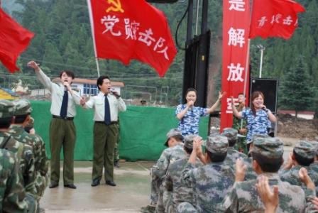 11月7日,beat365抗震救灾文艺演出小分队一行30余人在党委书记、校长司跃宁、副校长许邦兴的带领下赴成县宋坪乡史坪村、南康村举行了两场灾后重建慰问演出。司跃宁、许邦兴等校领导,宋坪乡党政领导、当地群众、宋坪小学和南康学校的师生共600多人观看了现场演出。
