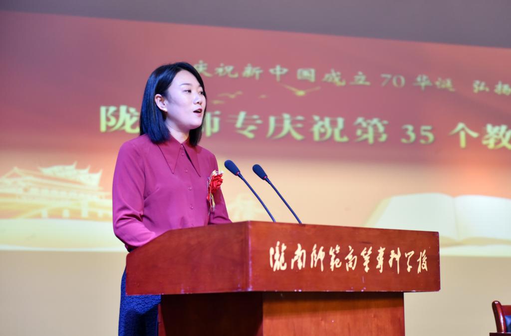 刘先春代表学校向兢兢业业、勤耕不辍在教学、科研、管理与服务一线的全校教职工致以节日的问候!向今天受到表彰的先进个人致以衷心的祝贺!向长期以来为学校发展贡献智慧和力量的老领导、老教师、老同志致以衷心的感谢!向新加入陇师的青年教师表示热烈的欢迎!