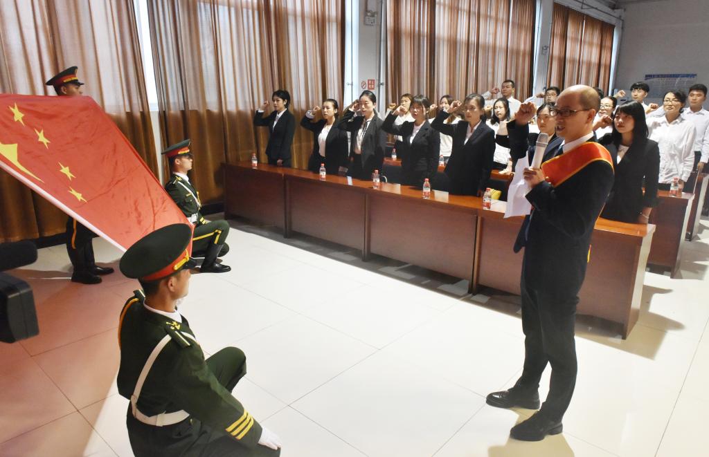 会上,在甘肃省领军人才、美术与设计学院副院长蔡副全教授带领下,19名新入职教师全体起立,面向国旗,举起右手,庄严宣誓:我志愿成为一名人民教师,忠诚党的教育事业,遵守教育法律法规,履行教书育人职责,引领学生健康成长,做到有理想信念、有道德情操、有扎实学识、有仁爱之心,为教育发展、国家繁荣和民族振兴努力奋斗!