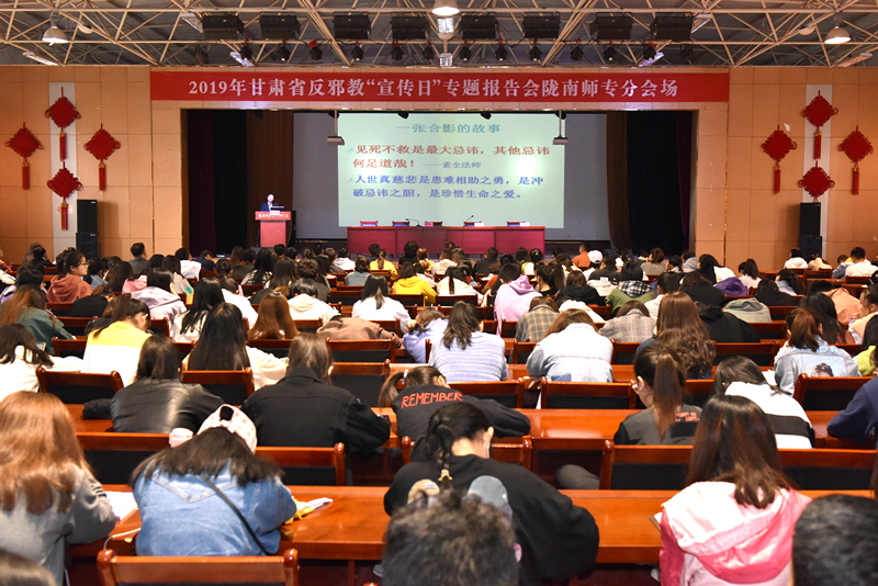 校党委副书记、纪委书记王莹成,省反邪教协会秘书长刘瑞,陇南市科协副主席庆海云,省反邪教协会讲师团成员、省委党校张巧艳教授出席了报告会,师生代表500多人聆听了报告。王莹成主持报告会。